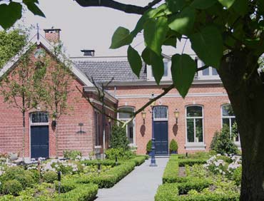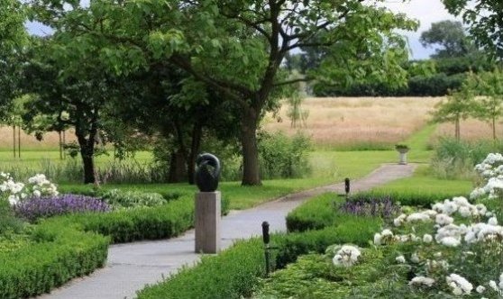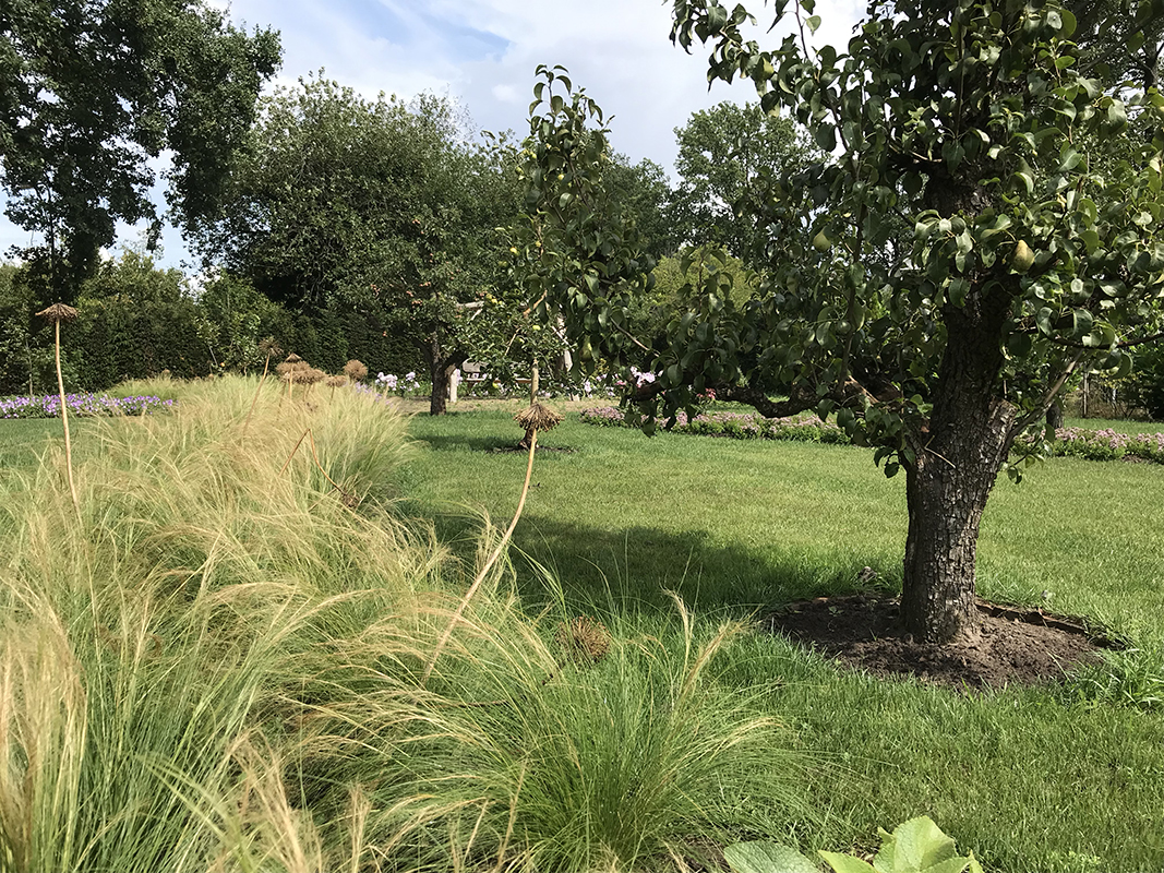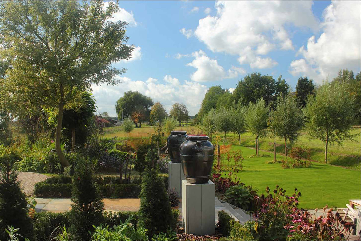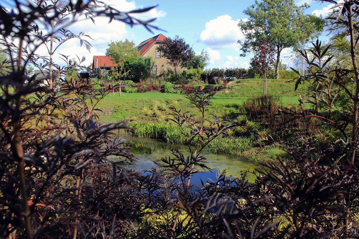 Landschappelijke tuin bij woonboerderij, Strakke tuin met vijver en ‘zwevend terras’ , Klassieke borders bij villa, Tuinontwerp voor het Leontienhuis